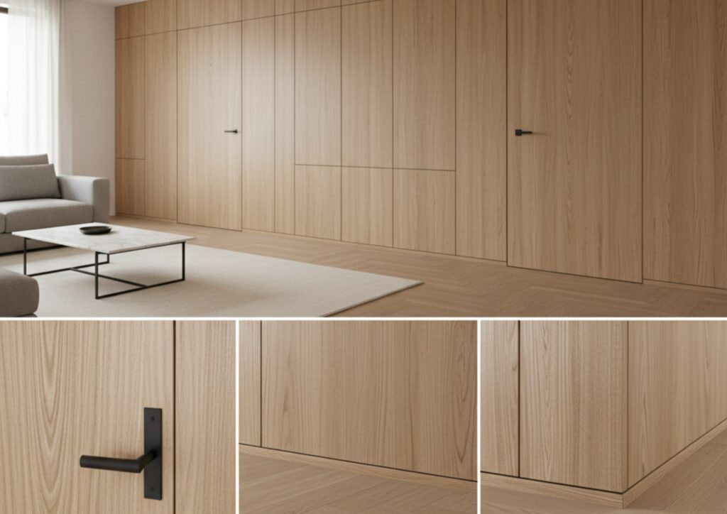 No basta con tener una hoja enrasada. Hace falta cuidar medidas, encuentros, herrajes, estabilidad, compatibilidad entre revestimiento y puerta, dirección de veta o patrón, continuidad entre paneles y comportamiento del conjunto en uso diario. Cuanto más limpio y minimalista es el diseño, más evidente resulta cualquier error.